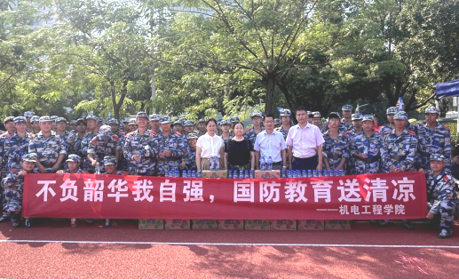 本网讯(通讯员 周良 杨涵宇/文 谭闺臣 倪君仪/图)为缓解持续高温给新生军训带来的“烤”验,9月24日下午,机电工程学院在训练场、“匠心积淀”一站式学生社区开展“不负韶华我自强,国防教育送清凉”活动,慰问正在高温烈日下坚持训练的教官和新生。学院党政领导班子,学工办全体成员参加。