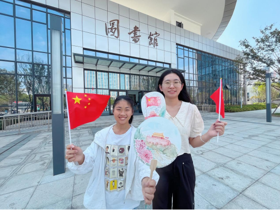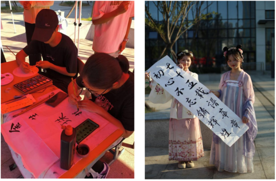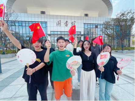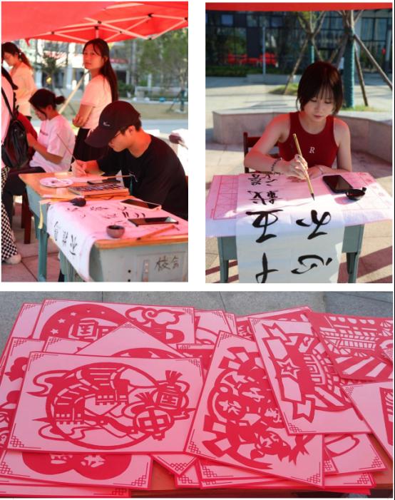 图书馆前的北广场上十分热闹,书画爱好者现场挥毫泼墨,抒发心中爱国情怀。转眼间,长桌旁已经晾晒了数十幅书法作品,有“爱我中华”“祖国您好”“国泰民安”等。另一侧,手工爱好者们现场剪纸,寥寥几剪,“祖国生日快乐”字样就跃然成型,围观的同学们无不称好。在汉服展示环节中,同学们以四季为序,他们或手持团扇,或身着宽袍广袖,或头戴金钗步摇,少女们“半踏长裙宛约形”,一颦一笑、一挥一扬将汉服之美表现得淋漓尽致,将“衣冠上国、礼仪之邦”的中华文化穿越再现,用优美的舞姿向新中国成立75周年华诞献礼。