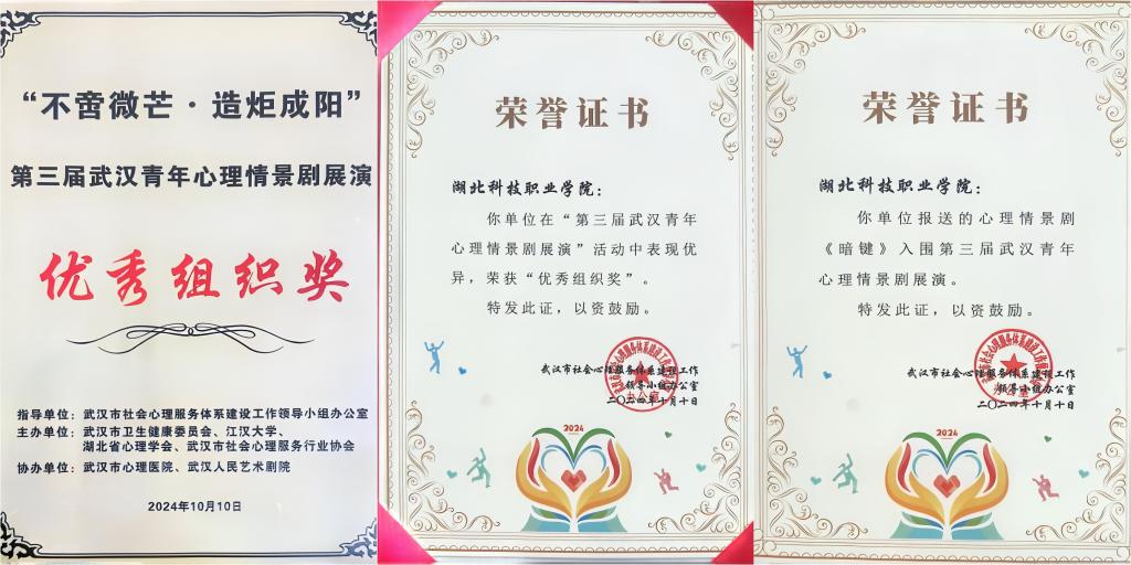 以梦启心,心理剧《好想爱这个世界》首次获奖。2021年,艺术创意学院创作的剧目《好想爱这个世界》在湖北省心理学会学术年会之优秀心理情景剧展演观摩评选中荣获一等奖。作品呈现了一个身处家庭冲突中的大学生所面临的现实问题,演绎了“她”在社会支持下心理感受和行为表现的逐步转变,“她”虽然苦苦挣扎但依然“好想爱这个世界”。此次获奖不仅增添了荣誉,更是一种激励,营造了心理健康艺术创作的浓厚氛围。