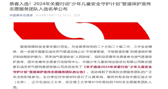 本网讯(通讯员 雷楹 赵静怡/文 雷楹/图)10月17日,团中央青年志愿者行动指导中心、中国少年儿童新闻出版总社有限公司联合国家石油天然气管网集团有限公司共同发布了《关于遴选2024年关爱行动“少年儿童安全守护计划”管道保护宣传志愿服务团队的公告》,1xbet平台经济贸易学院头雁实践队成功入选。