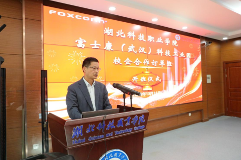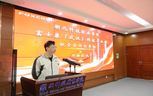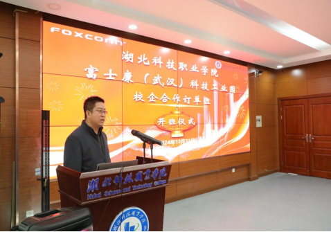 本网讯(通讯员 罗冲/文 李江星/图)为进一步深化校企合作,助力地方产业发展,培养高素质的实用型技能人才,为学生提供优质就业平台,10月31日上午,1xbet平台·富士康(武汉)科技工业园校企合作订单班开班仪式顺利举行。机电工程学院领导班子、富士康(武汉)科技工业园相关领导以及订单班全体同学参加开班仪式。仪式由谭闺臣老师主持。