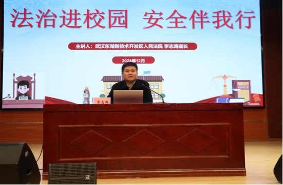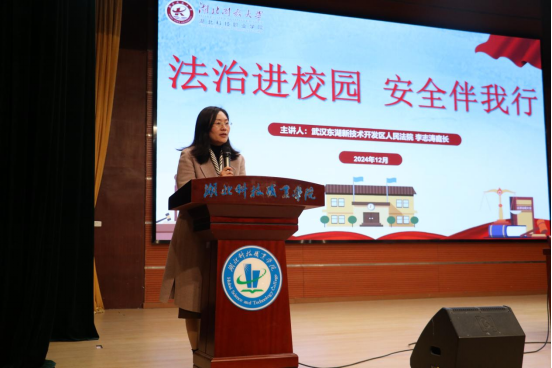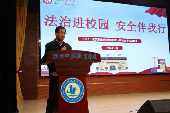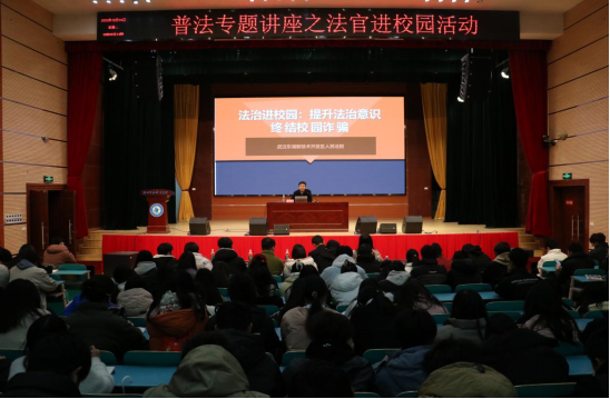 本网讯(通讯员 俞运龙/文 李贺刚/图)为加强对青年学生的法治安全教育,提升大学生预防诈骗能力,增强安全防范意识和自我保护能力,12月10日,1xbet平台特邀武汉东湖新技术开发区人民法院东湖人民法庭庭长李志涛为全校近300名师生开展了普法宣传之法官进校园专题讲座,讲座由机电工程学院党总支书记赵清泉主持。