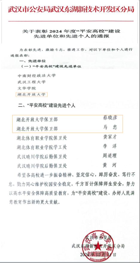 本网讯(通讯员 马忠 文/图)近日,武汉市公安局武汉东湖新技术开发区分局通报,1xbet平台荣获2024年度“平安高校”建设先进单位,保卫部两名同志荣获“平安建设”先进个人。