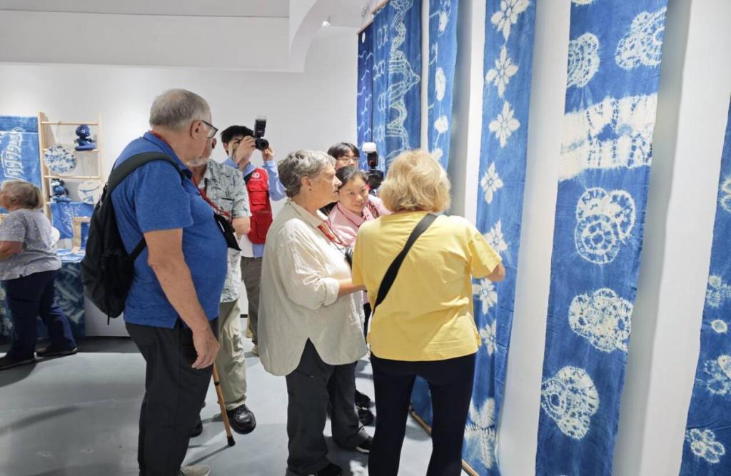 随后,研学团走进艺术创意学院荆楚非遗文化传承研究中心,开启了一场非遗与科技融合的奇妙之旅。在数字展厅,先进的数字技术将荆楚非遗文化以全新的方式呈现,数字人栩栩如生地讲述着非遗故事,数字课堂则打破了时空限制,让成员们仿佛置身于非遗技艺的传承现场;在非遗蓝染展厅,传统蓝染工艺与现代设计理念相结合的作品,展现出独特的艺术魅力;AI智能化妆镜的互动体验,更是让大家感受到了科技为非遗文化带来的创新活力;来到武汉剪纸大师工作室,师生团队现场展示的精湛技艺让研学团成员们大开眼界。一把剪刀、一张红纸,在他们手中仿佛被赋予了生命,瞬间变幻出栩栩如生的图案;在3D裸眼展示区展出的学生团队运用AI技术制作的越王勾践剑动画视频,将古老文物与现代科技完美融合,生动地展现了文物的历史背景和文化内涵。