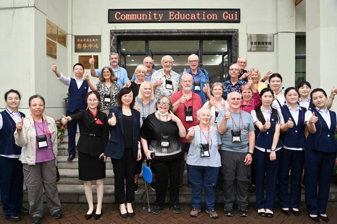 在社区教育学院,美国老年研学团走进湖北老年教育智慧课堂,亲身体验了智慧书法、无人机摄影、茶艺品鉴、钢琴、模特、古筝等特色教学课程。在智慧书法课堂,研学团学习如何手执毛笔,在数字化临摹屏上一笔一画勾勒汉字轮廓,教学系统实时捕捉运笔轨迹,从笔锋力度到结构比例进行智能评分,开启了一场融合传统文化与现代科技的学习体验;在无人机摄影教室,研学团手持操控手柄,随操控指令变换视角,科技赋能下的教育体验让他们眼中闪烁着兴奋的光芒;在茶艺教室,茶艺指导老师演示了中国传统泡茶工艺,讲解了湖北“茶圣故里”的文化渊源,让老年学者亲手体验了分茶、奉茶的礼仪,在茶香氤氲中感受东方生活美学的哲思。