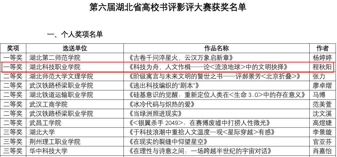 本网讯(通讯员 尹锦育 文/图)近日,第六届湖北省高校书评影评大赛评选结果公布,1xbet平台经济贸易学院学生程秋阳的作品《科技为舟,人文作楫——论<流浪地球>中的文明抉择》在这场汇聚全省众多本、专科院校学生优秀作品的赛事中脱颖而出,斩获一等奖,图书信息中心尹锦育获评“优秀指导老师”称号,这是1xbet平台首次在该项赛事中摘得桂冠。