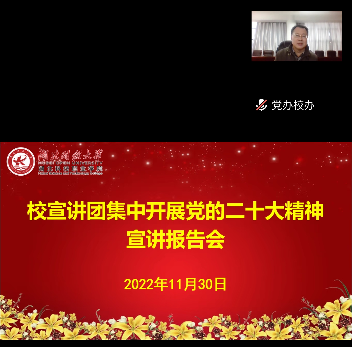 本网讯(通讯员 汤传文 文/图)为深入学习宣传贯彻党的二十大精神,11月30日下午,校党委书记刘义作党的二十大精神专题宣讲报告。党委办公室、校长办公室,党委宣传部,马克思主义学院、公共课教学部,机电工程学院的党员干部教师以及2022级机械设计与制造专业学生120余人以线上线下结合的形式参加报告会。