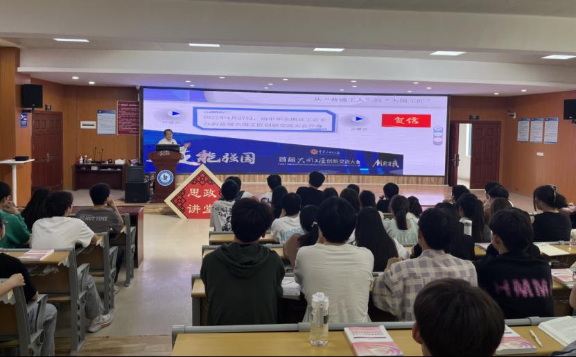 讲课以立足科技前沿,贴近学生专业的形式开场。结合青年学生们所学的物流管理专业,钟毓宁带领大家了解目前行业内解决“最后一公里”配送问题的新发明,观看了无人送物机器人、仓储机器人的精彩视频短片,并以我国召开的首届大国工匠创新交流大会为切入点,帮助同学们树立技能强国理念,理解劳模精神、劳动精神和工匠精神的深刻内涵和紧密关系。