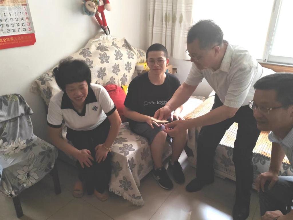 25日上午,骄阳似火,刘义一行抵达刘子银同学家庭所在地江夏老城区龙头街道时,刘子银便早早等待在路边。穿过狭长的巷子,一行人在刘子银的带领下登上了老旧的楼梯,到达六楼家中。刘子银母亲热情迎接,激动不已,“一周前听孩子说学校领导老师要来我们家,今天见到真人还是不敢相信”。