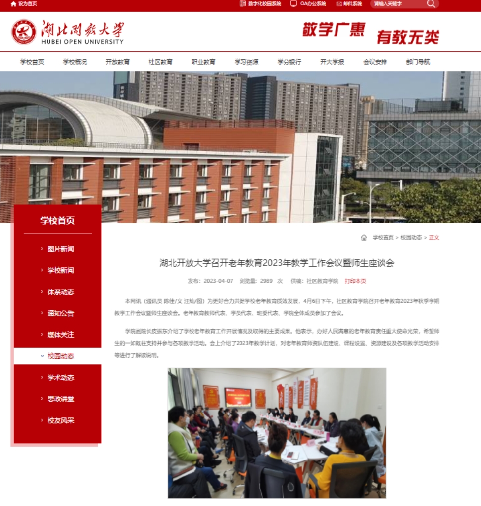 主动作为当好“领头雁”。针对以上调研的集中问题,梳理形成“问题清单”,学院制定时间表,院领导、党员干部主动认领,对标对表,逐项销号。学院一方面充分利用各类平台如湖北社区教育网、微信公众号、抖音号、视频号等推送海量学习资源服务全省社区居民线上学习需求,提升社区教育惠及面。以“湖北社区教育网”为例,截止目前,已汇集有国家开放大学(国家老年大学)、全国兄弟开大、全省多级社区教育指导中心等的优质社区教育资源3000余讲(自建资源1000余讲),开辟“老年教育线上课程资源库”等专栏,举办线上线下楚菜文化、京剧、中医养生等主题“中华传统文化进银龄课堂”系列公益讲座,点击量已超过3000余万次。